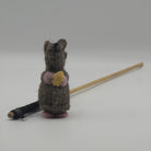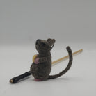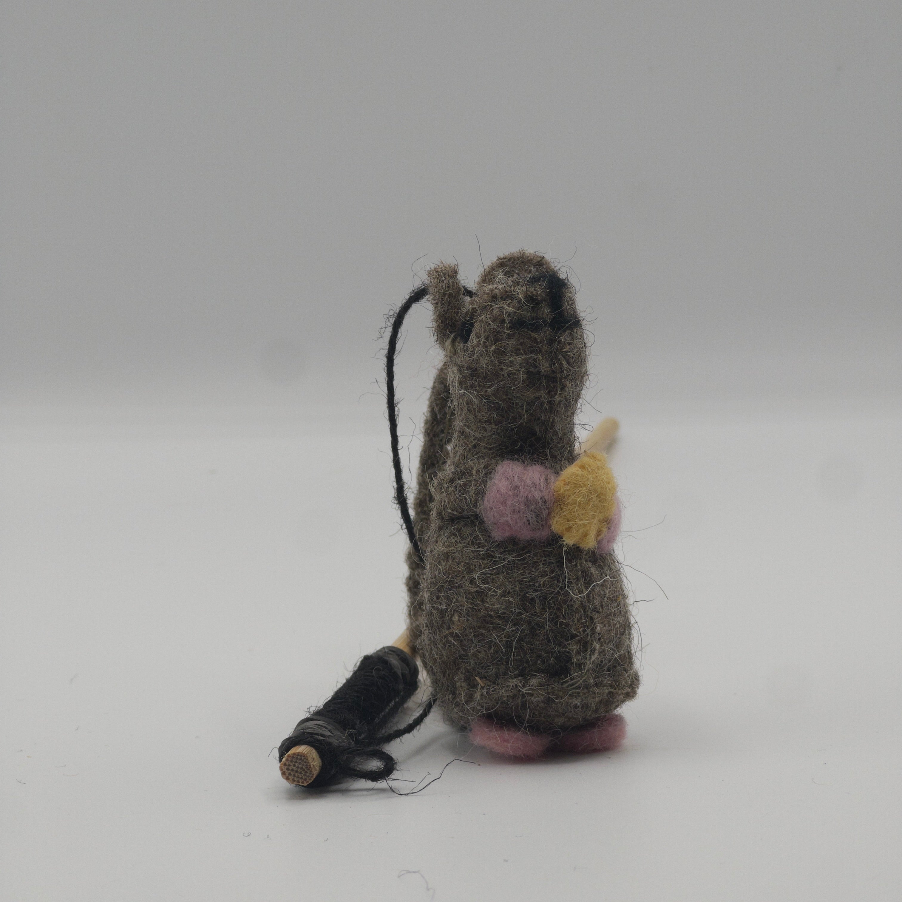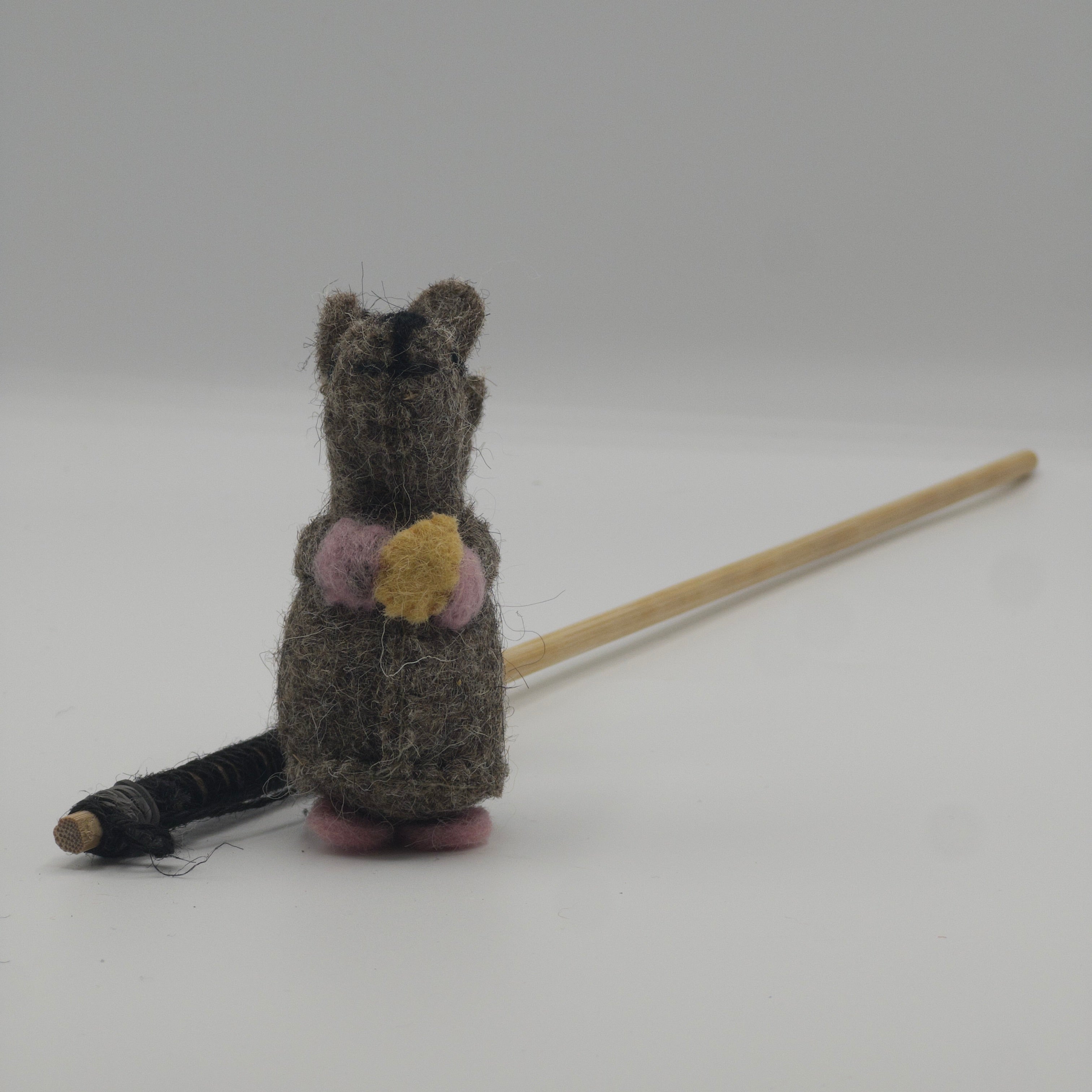 Made with sustainable and natural materials; wool felt, jute string, and a bamboo wood stick. Produced without using any added compound that would harm or be released when chewed.